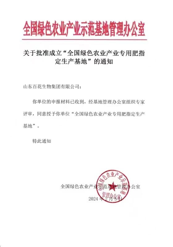 2024年2月5日,山东百花生物集团有限公司,荣获“全国绿色农业产业专用肥指定生产基地”殊荣。