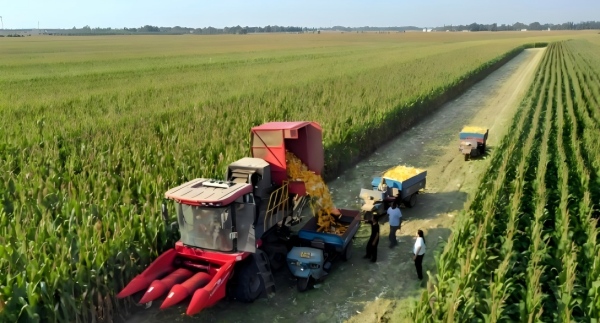 眼下正值玉米收获期,在山东省菏泽市单县徐寨镇的规?;种灿衩滋锢?,玉米收割机正在田间奔跑忙碌着采收玉米。
