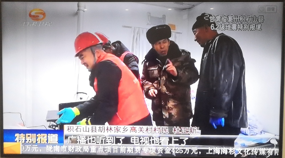 地震發生后,根據國家廣電總局衛星直播管理中心的倡議和部署,青島海盈電子有限公司立即向震區捐贈新一代直播衛星戶戶通設備20套,包括新一代單、雙模衛星直播系統高清綜合接收解碼器、北斗專用高頻頭、衛星接收天線、饋線等。設備已于12月27日緊急抵達甘肅省廣電局并由廣電局第一時間安排專人派發、安裝到地震災區,震區群眾可以在第一時間通過戶戶通設備收聽收看93套直播衛星電視節目和46套廣播節目,通過廣播電視及時收聽收看抗震救災報道和生產自救知識。